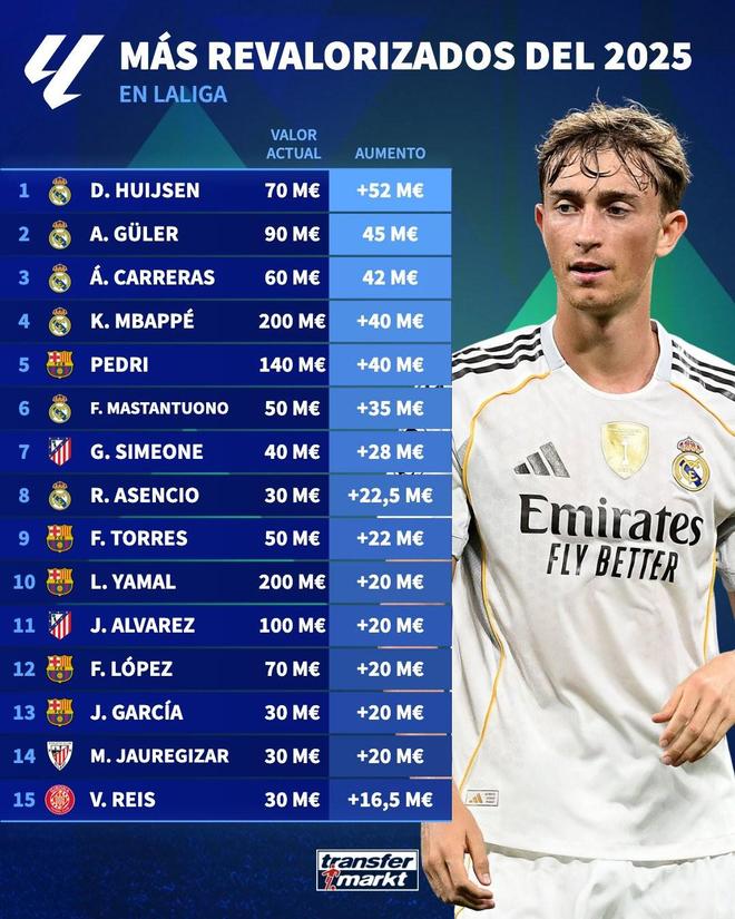 北京時(shí)間12月24日,德轉(zhuǎn)列出了2025年身價(jià)漲幅最高的15名西甲球員,赫伊森一年時(shí)間身價(jià)暴漲520